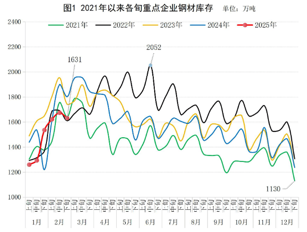 2025年2月下旬,重點(diǎn)統(tǒng)計(jì)鋼鐵企業(yè)(以下簡(jiǎn)稱“重點(diǎn)企業(yè)”)鋼材庫存量1631萬噸,環(huán)比上一旬減少42萬噸,下降2.5%;比年初增加394萬噸,增長31.9%;比上月同旬增加96萬噸,增長6.3%;比去年同旬減少171萬噸,下降9.5%,比前年同旬減少111萬噸,下降6.4%(見圖1)。